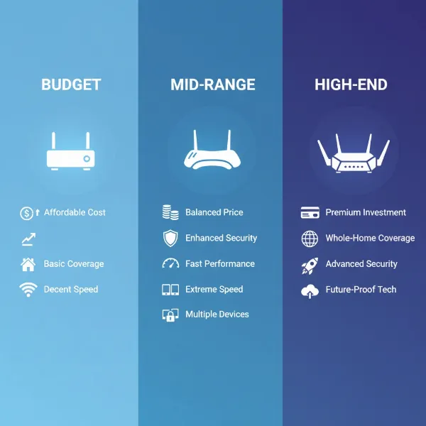 [image-3|wifi-6-router-price-tiers|Three distinct Wifi 6 routers, visually representing budget, mid-range, and premium tiers, arranged on a gradient background from light to dark, with subtle price tag icons.|